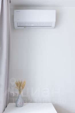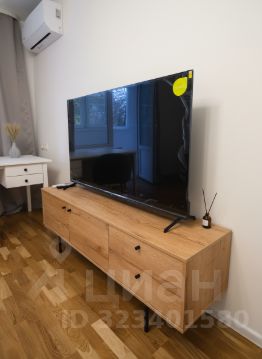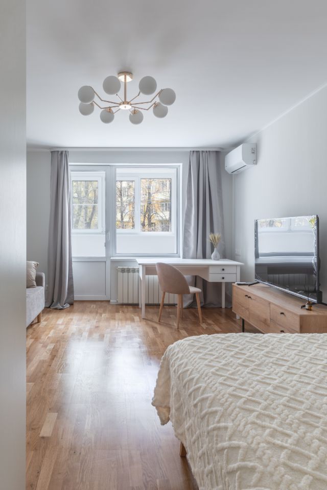 Телевизор 4К, 55 дюймов с Google TV. В комнате инверторный кондиционер AUX. На полу паркетная доска.