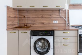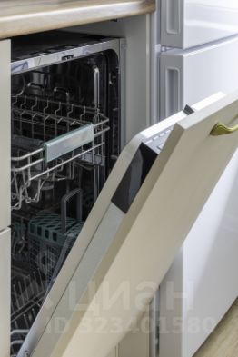 На кухне посудомоечная машина, стиральная машина с функцией пара, СВЧ, большой холодильник. На полу керамогранит.