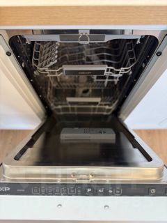 В квартире установлен кухонный гарнитур со встроенной посудомоечной машиной, плитой и вытяжкой; чайник, холодильник, посуда, барная стойка и барные стулья.