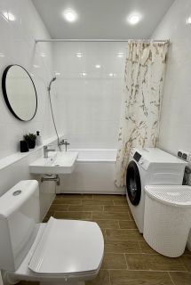 В ванной комнате установлена стиральная машинка, электрический полотенцесушитель, имеется сушилка для одежды.