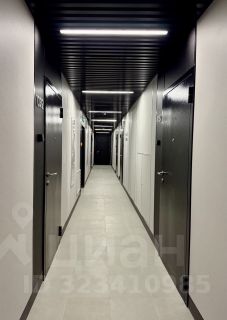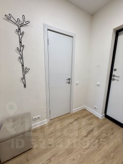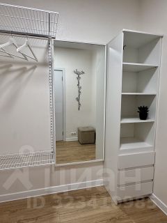 В коридоре размещена система хранения, большое зеркало, шкаф, мягкая тумба.