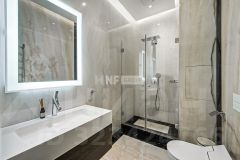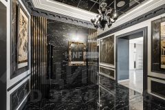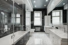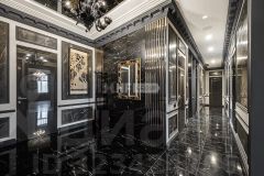 Внутреннее пространство выдержано в стиле современной классики. В отделке использованы дорогостоящие материалы: мрамор, массив дуба. Спальни укомплектованы мебелью Roberto Cavalli и Mania, установлена антикварная мебель Zanaboni, керамика Villeroy&Boch, сантехника Philippe Starck и Duravit.