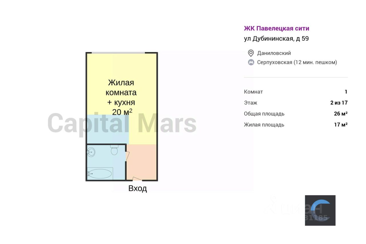 Предлагается 1-комнатная квартира общей площадью 26 м² в ЖК "Павелецкая сити" недалеко от станции метро "Серпуховская". Для комфортного проживания в наличии имеется вся необходимая мебель, а также нагреватель воды. Кухонный гарнитур оснащен духовой печью. Окна обращены на улицу.