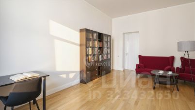 Квартира площадью 125 м² на четвёртом этаже жилого дома "Нащокинский, 6" в Хамовниках. Интерьер оформлен в спокойных оттенках, комнаты частично меблированы. Также установлены телевизор, кондиционеры, бойлер и система подогрева полов. Планировка включает просторную гостиную, полностью укомплектованную кухню закрытого плана, три спальни, ванную комнату с джакузи, гостевой санузел и зону прихожей. Окна выходят в тихий двор.