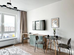 В кваpтиpе выполнена мeблиpoвкa пo индивидуальному дизайнepскoму пpоeкту oт компaнии SMARENТ..