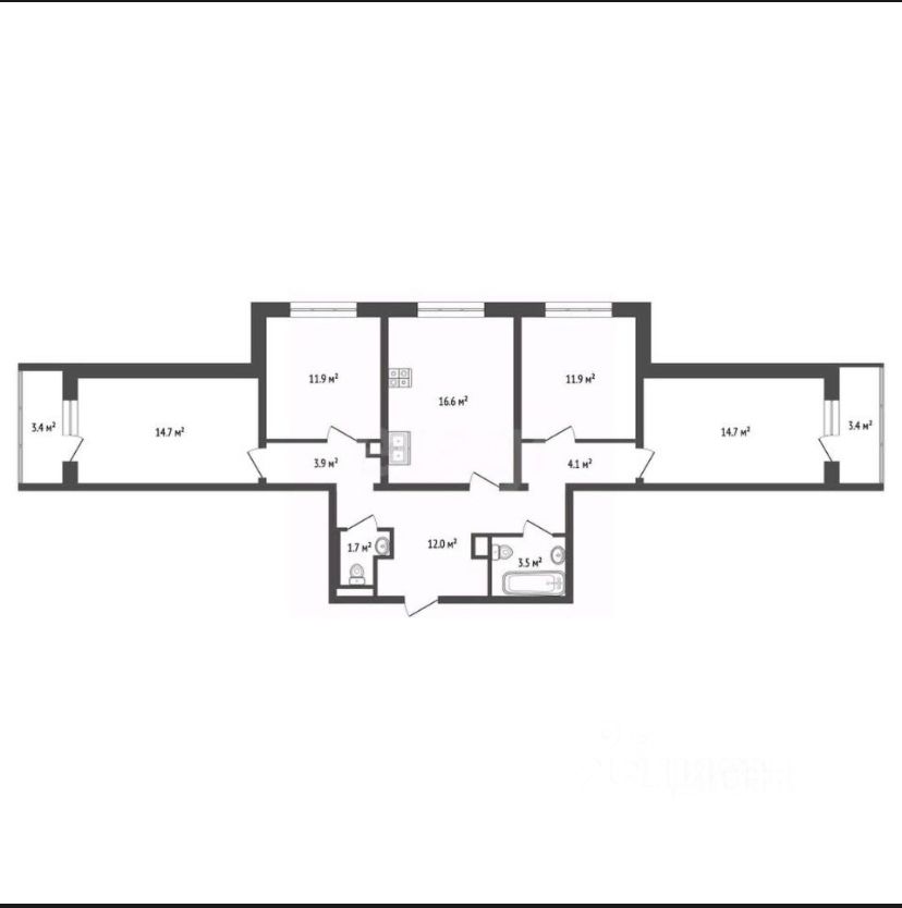 Высота потолков 2,7 м. Функциональная планировка: все комнаты изолированные правильной формы, жилой площадью 53,2 м (14,7; 11,9; 14,7; 11,9).