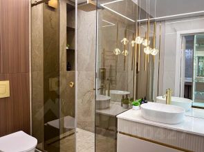 Техника: посудомойка, стиральная машина с функцией сушки, 3 кондиционера, встроенный холодильник, микроволновка, духовой шкаф, водный камин (полная имитация огня, оч красиво и при этом безопасно), телевизор, фильтр для воды. Техника Bosch! Теплые полы. Система от протечек Нептун. Дорогие ортопедические матрасы. Каменная столешница на кухне и в ванной, каменные подоконники.