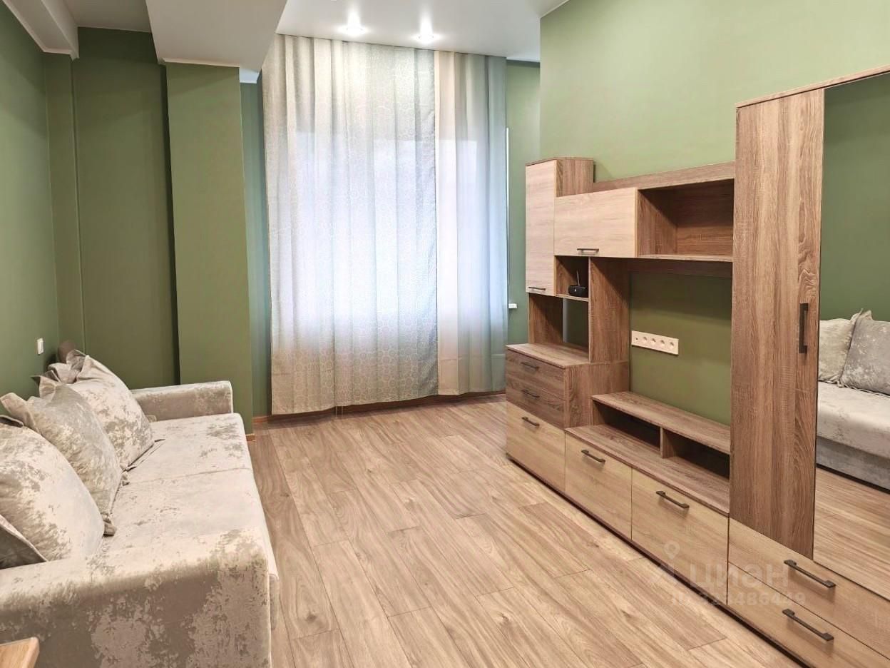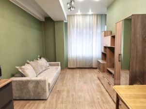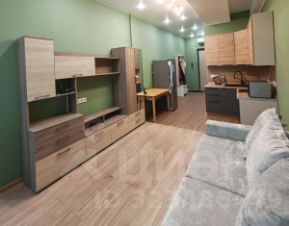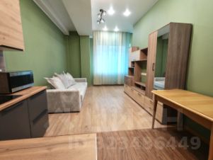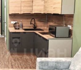 В квартире выполнен качественный евроремонт. Просторная жилая зона 20 кв. м объединена с кухней площадью 5,5 кв. м, что позволяет рационально использовать пространство. В студии есть всё необходимое: современная мебель на кухне и в комнате, а также техника — кондиционер, холодильник и стиральная машина. Санузел совмещён, оборудован душевой кабиной.