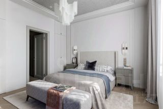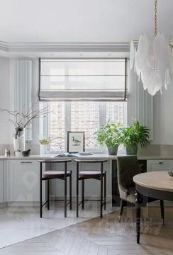 Интерьер выполнен в классическом стиле в светлых тонах с использованием натуральных материалов — дерева, паркета и тактильных текстур.