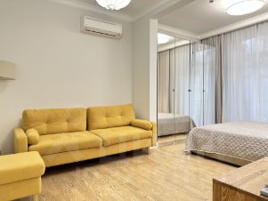 Первая спальня -зона гостиной с раздвижным диваном и пуфиком напротив которого стоит телевизор, установлен кондиционер
