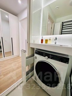 В санузле установленна современная стиральная машина в тумбе с умывальником и местом хранения бытовой химии. Зеркало большое с подсветкой, шкаф подвесной и современная душевая система.