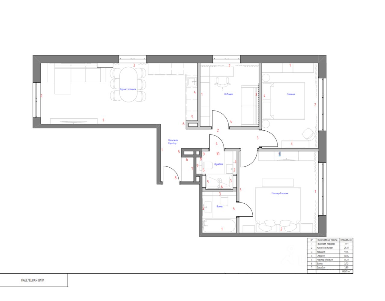 Квартира с функциональной планировкой, распашонка, окна смотрят во двор, 3 изолированные комнаты, мастер спальня, оборудована собственным санузлом и ванной -17,2 кв.м., спальня 12,8 кв.м., кабинет 9,95 кв.м. Высота потолков 3 метра, современная кухня-гостиная 25,1 кв.м. Второй санузел (гостевой), оборудован душевой кабиной.