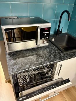 Кухня: холодильник, плита, микроволновка, посудомоечная машина, вся необходимая посуда.