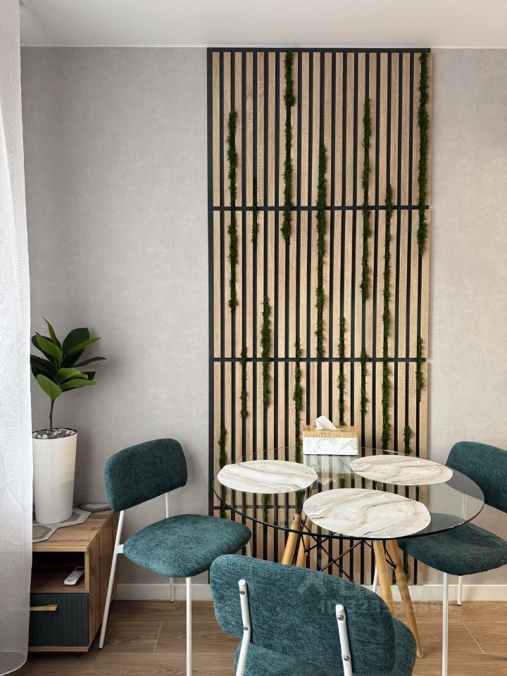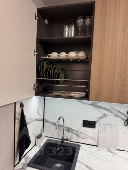 Вся мебель в квартире дизайнерская, благодаря этому создана атмосфера уникальности, комфорта и уюта. Здесь есть всё необходимое для комфортного проживания: кондиционер, холодильник, посудомоечная и стиральная машины, телевизор, сушилка для белья. Можно сразу заехать и жить без дополнительных хлопот и затрат. Санузел совмещённый, оборудован ванной, зеркалом-шкафом.
