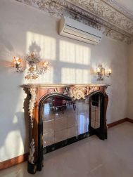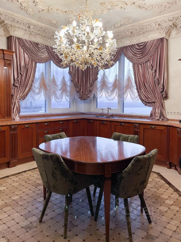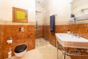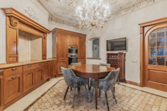 В отделке квартиры использованы материалы премиального уровня: венецианская штукатурка, лепнина на потолках во всех помещениях, мрамор на полу и в отделке санузлов, подоконников, паркет из ценных пород дерева, деревянные стеклопакеты, дубовые двери и тд.