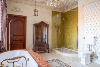 Во всех помещениях люстры MECHINI и светильники и люстры EICHHOLTZ, в спальнях, ванных и гостиной шторы из парчи и итальянского кружева.