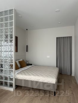 Удачная планировка: кухня-гостиная и спальня, отделенная стильным стеклянным блоком. Просторный санузел с ванной.