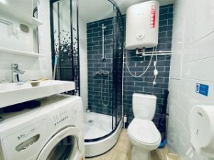 В ванной комнате - шкаф для хранения вещей, корзина для белья, шкафчик с зеркалом для хранения средств личной гигиены. Одноразовые гели, шампуни, мыло, тапочки .