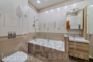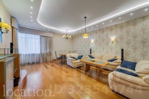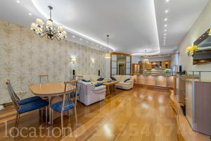 Общая площадь 150 кв. м. В квартире выполнен качественный ремонт по европейским стандартам. Пространство включает светлую гостиную, совмещенную с кухней, обеденную зону, три изолированные спальни, две полноценные и одну гостевую ванные комнаты, а также балкон.
