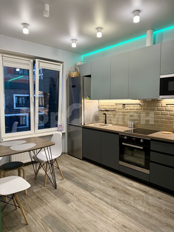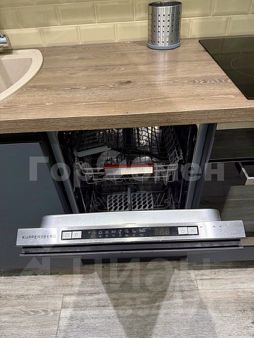 В кухне-гостиной - кухонный гарнитур со встроенной техникой: плита, духовка, посудомоечная машина, микроволновка.