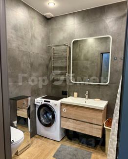 В ванной-стиральная машина, шкафчик, ванная, зеркало.