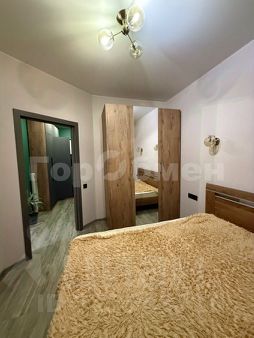 В спальне стоит двуспальная кровать, шкаф, две прикроватные тумбочки.