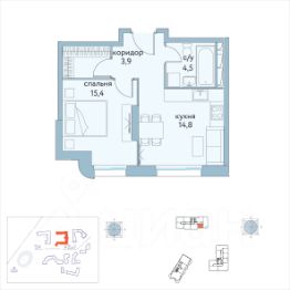 Площадь: 38,2 м², удобная планировка - отдельная спальня на 15 м², полноценная гардеробная с местом для хранения, кухня 15 м² со спальным местом.