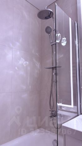 в ванной тропический душ, гигиенический душ и стеклянная перегородка, встроенный шкаф над стиральной машиной с сушкой.