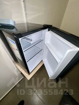 В комнате есть двуспальный раскладной диван, шкаф, столик, маленький холодильник и микроволновка.