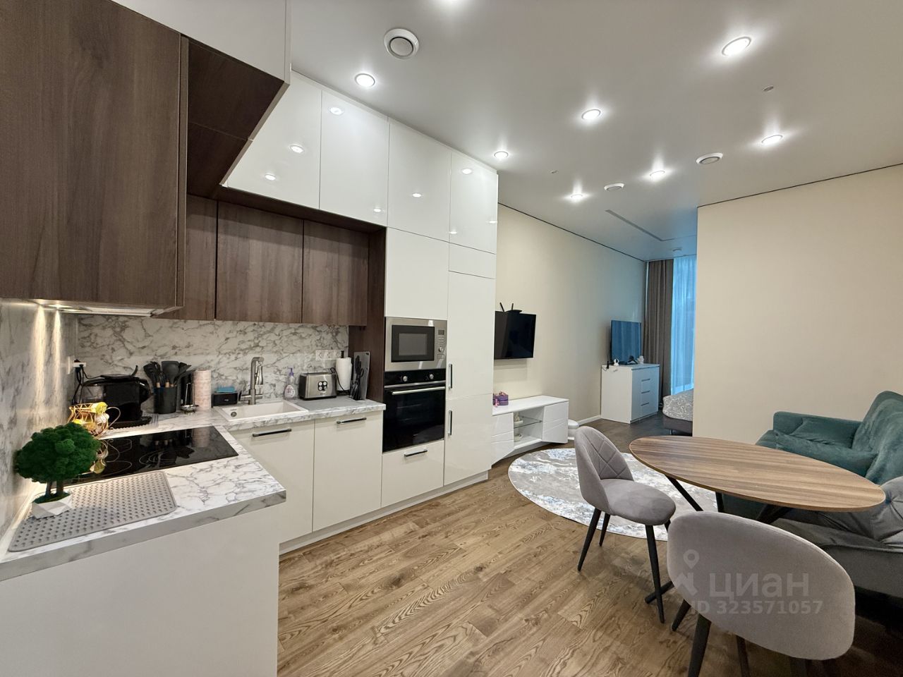 Студия с панорамными окнами, выходящими на собственный внутренний двор, полностью укомплектована современной мебелью и техникой для комфортного проживания.