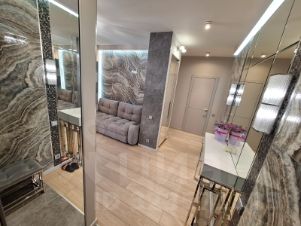 Планировка: Гостиная совмещенная с кухней - спальня - кабинет или детская - гардеробная - раздельный сан узел. Квартира полностью укомплектована современной мебелью и техникой от ведущих производителей. Кондиционеры в каждой комнате. Вместительные шкафы. Подогрев полов. Качественная, дорогая сан техника. Кухонный гарнитур. Посудомоечная машина. Стиральная машина. Видео домофон.