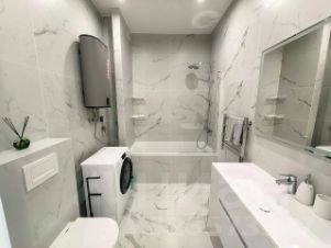 Кухонный гарнитур оснащен посудомоечной машиной, духовой и микроволновой печью, фильтром осмос, отдельно встроенными холодильником и морозильником. В санузле установлен мощный водонагреватель на случай отключения, стиральная машина, в гостиной - кондиционер.