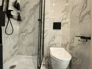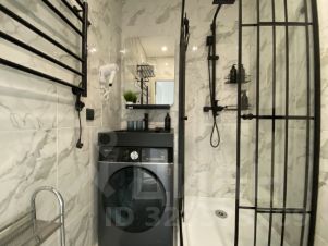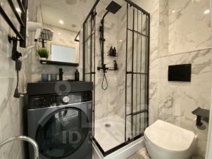 Современный санузел: Чистота и комфорт обеспечены благодаря стеклянной душевой кабине, стиральной машине со встроенной функцией сушки и паром, подвесной раковине и инсталляции.