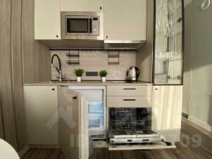 Зона кухни: Вас ждет полностью укомплектованная кухня с индукционной варочной панелью, посудомоечной машиной, полноразмерным холодильником, стильной вытяжкой и микроволновой печью с грилем. Для вашего удобства есть фильтр для питьевой воды прямо в мойке, смарт-чайник и полный набор качественной посуды (кастрюли, столовые приборы, стеклянная посуда).