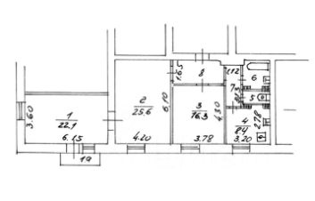 В квартире две изолированных спальных комнаты (22,1 + 16,3 кв. м.) и проходная гостиная (25,6 кв. м.). Есть балкон.