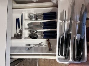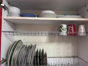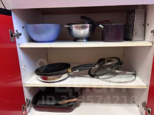 - просторную кухню (10 м) в ярких тонах с посудой и приборами