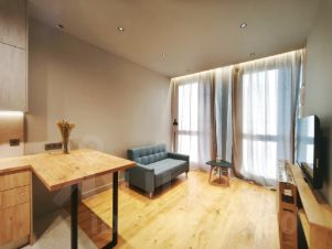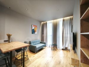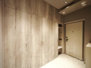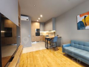 Студийная планировка: кухня-гостиная, спальная комната, просторный коридор, совмещенный санузел.