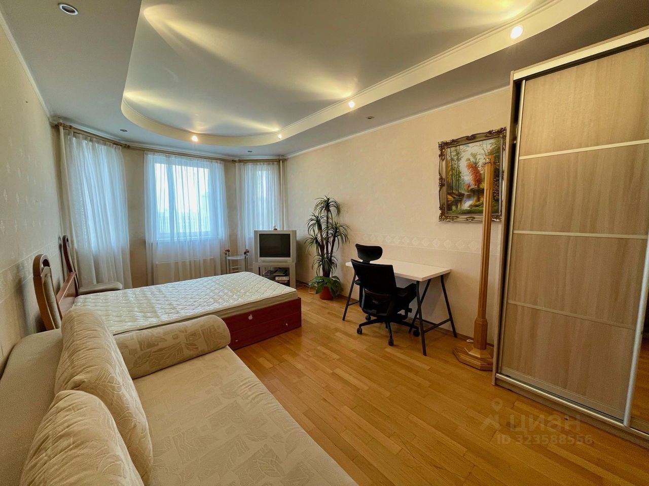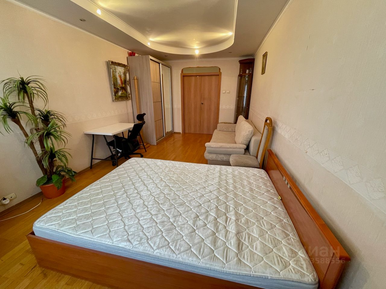 В комнате двуспальная кровать , отдельный очень большой шкаф, беспроводной wi fi , телевизор .