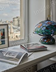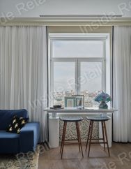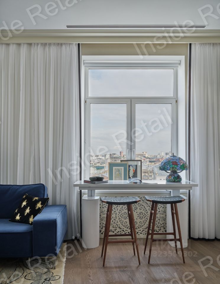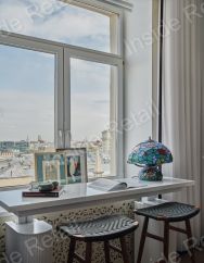Барная стойка быстро по нажатию пальца трансформируется в рабочее пространство продолжение большого подоконника с панорамным видом на историческую часть Москвы.