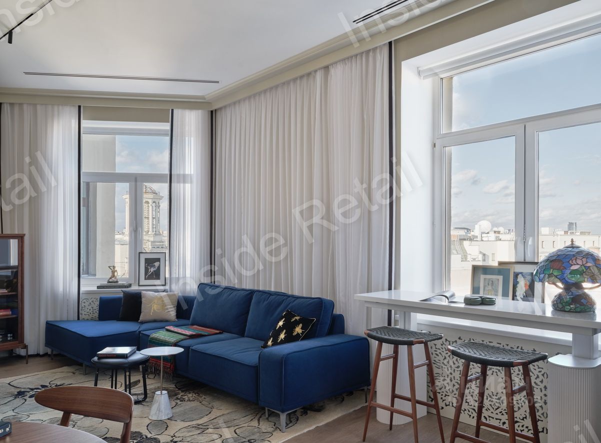 Сдается угловая панорамная квартира на последнем этаже в Доме Нирнзее. Прекрасный вариант для одного человека, пары: просторная гостиная, совмещенная с кухней, изолированная спальня. Вид на московские крыши, ротонду и звезды Дома под юбкой. Теплая молочная палитра с цветовыми акцентами. Тихий переулок, пешком - минута до метро Пушкинская, пять минут - до Патриарших, десять до Кремля.