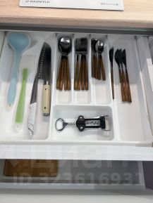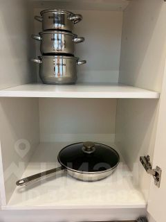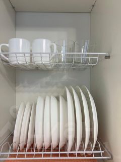 Кухонный гарнитур со встроенной техникой(варочная панель, вытяжка, микроволновая печь, холодильник). Так же в вашем распоряжении набор столовой посуды 16 предметов, набор кастрюль,сковородка и набор столовых приборов.