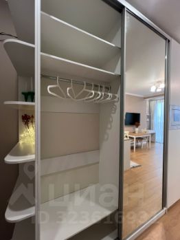 В прихожей - просторный зеркальный шкаф купе в пол. С большим количеством полок, ящики для хранения белья, несколько отсеков со штангой, а так же встраиваемая поворотно-выдвижная гладильная доска, которая помогает максимально экономить свободное пространство.