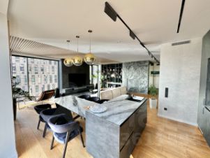 Квартира имеет дизайнерский ремонт и полностью готова к проживанию. В каждой комнате есть мебель, на кухне установлена современная техника: холодильник, варочная панель, духовой шкаф, вытяжка, микроволновая печь, кофеварка, соковыжималка, мясорубка, планетарный миксер, блендер, кастрюли и сковородки, формы для выпекания и прочее, столовые приборы, наборы посуды, бокалов, чашек и прочее, cтиральная машина, сушильная машина, утюг, отпариватель, гладильная доска. Для вашего удобства в квартире два совмещенных санузла, один из которых оснащен ванной с душевой, а другой душевой кабиной. Также в наличии телевизор, биокамин, музыкальная система на Hi-Fi компонентах B&O, интернет.