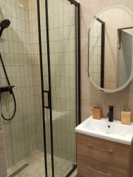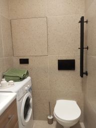 - Санузел оснащен стиральной машинкой, душевой кабиной с подсветкой, большим зеркалом с различными режимами подсветки, электрическим полотенцесушителем, стильным набором для санузла и набором чистых полотенец;