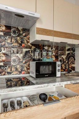 В квартире есть вся необходимая бытовая техника (холодильник, стиральная машина, кондиционер, варочная панель, телевизор, микроволновая печь, эл. чайник, утюг, фен), комплект посуды для приготовления и приема пищи, гладильная доска, напольная сушилка для белья, в квартире постоянно горячая вода (установлен водонагреватель), Wi-Fi.