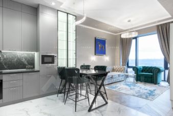 Новый ремонт выполнен в актуальном современном стиле. Высокие потолки 3,3 метра создают ощущение простора и наполняют комнаты светом. Практичная европланировка включает: