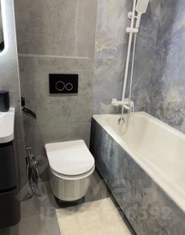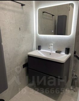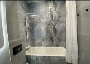 Весь пол в квартире из широкоформатного керамогранита (600х1200мм). В ванной комнате установлены подвесной унитаз, подвесная раковина, подвесная тумба, подвесное зеркало, т.е. все сделано для удобства уборки и гигиены в полу (без углов и мест скопления грязи/бактерии). Стены и пол в ванной комнате отделаны широкоформатным керамогранитом двух видов. Установлена чугунная ванная с системой регулировки воды и тропическим душем.