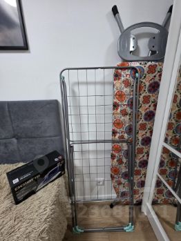 Также из бытовых мелочей имеются чайник, утюг, гладильная доска с сушилкой для одежды и пылесос.