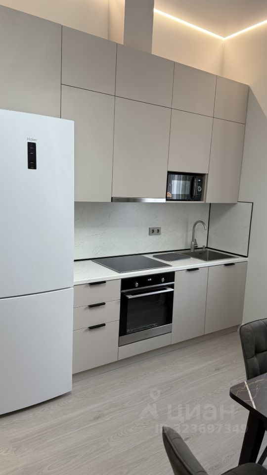 Квартиры оборудованы кухонным гарнитуром, мебелью и бытовой техникой. Есть варочная панель, вытяжка, духовой шкаф, чайник, холодильник, телевизор, стиральная машина, электрический полотенцесушитель и роутер.