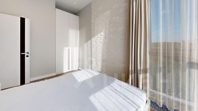 Квартира имеет продуманную планировку и панорамные окна: 2 изолированные спальные комнаты, кухня, просторная гардеробная и туалетная комната с душевой.